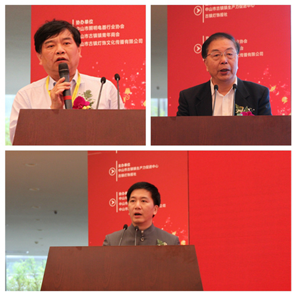 中國(guó)照明學(xué)會(huì)秘書長(zhǎng)竇林平(左上)、中山市古鎮(zhèn)鎮(zhèn)黨委委員何勝?gòu)?qiáng)(下)、中國(guó)照明電器協(xié)會(huì)副理事長(zhǎng)兼秘書長(zhǎng)陳燕生分別發(fā)表講話(右上)